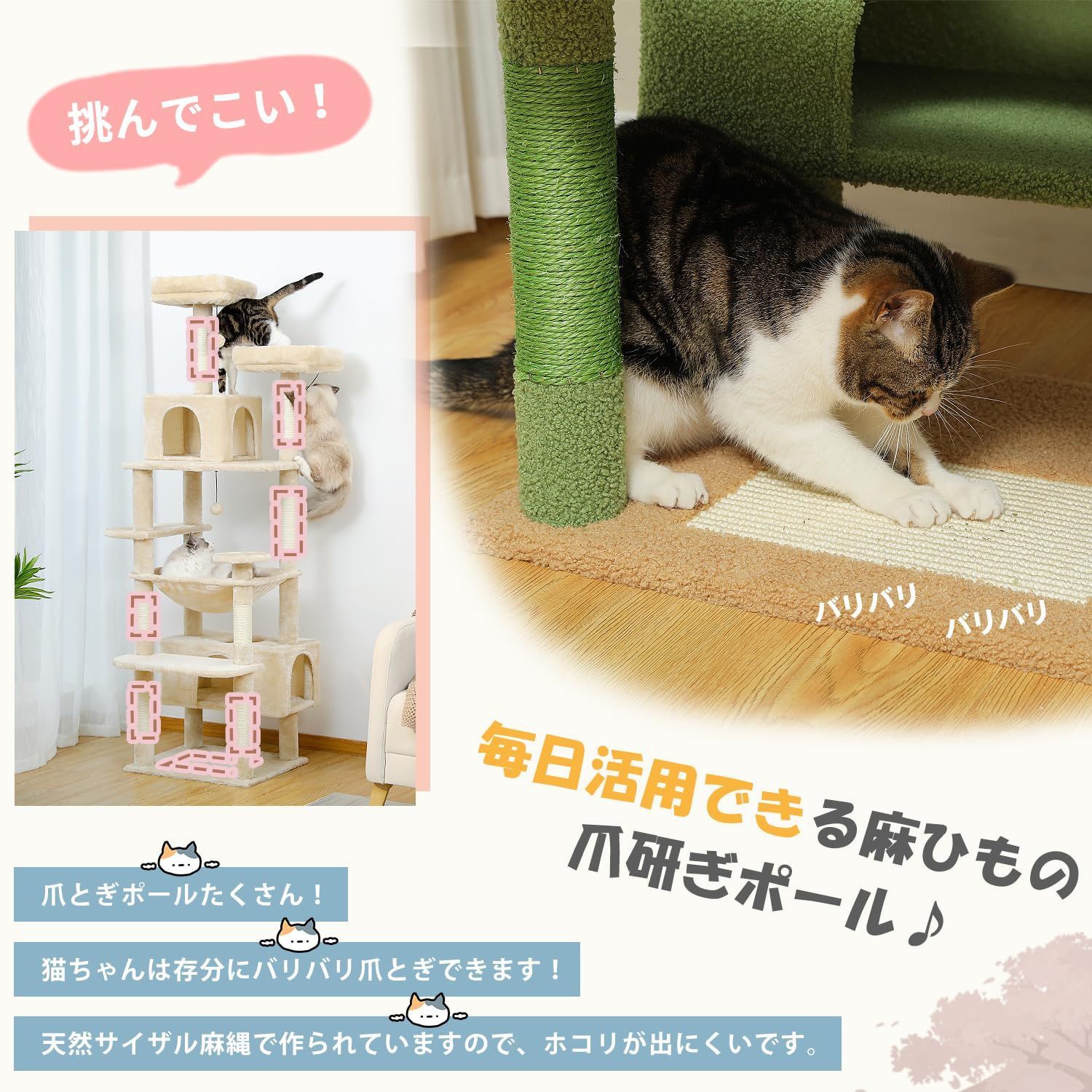 PETEPELA(ぺテぺラ) キャットタワー 大型猫用 コンパクト 多頭飼い 据え置き型 スリム ハンモック 麻紐爪とぎポール 猫のおもちゃ 転倒防止ベルト付き 展望台 猫ベッドカバー取り外し可能 運動不足解消 - 高さ180cm ベージュ