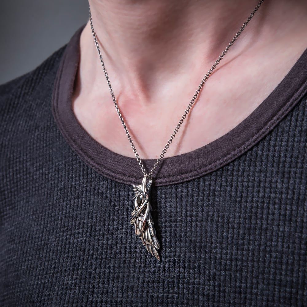 Two worlds in one pendant: layered wings—angel and devil—sculpted in clean tiers. Each feather is finely carved, and the reverse is fully finished so the piece moves with life from every angle. A deep-set black cubic zirconia anchors the design, catching light and lending quiet strength at the collarbone. The silhouette reads like modern sculpture, pairing effortlessly with both everyday looks and sharper, fashion-forward styling. Crafted in our workshop by experienced hands—formed, engraved, and polished for a pleasing weight and a smooth, comfortable wear. Branded and hallmarked “925” on the back. Wings symbolize rise and momentum; keep this piece close as a subtle talisman.