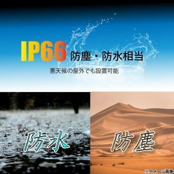 IP66防水防塵相当仕様でほこりや水に強い設計。悪天候の屋外でも設置可能。動画解像度フルハイビジョンで、昼間でも夜間でもしっかり撮影。
