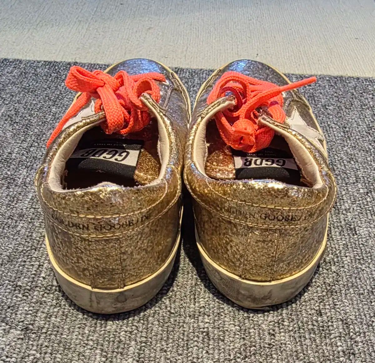 ゴールデングース 金色グリッター靴 33サイズです。鮮やかなオレンジ色靴紐でポイントをつけました。購入後数回しか履かずに保管のみしました。