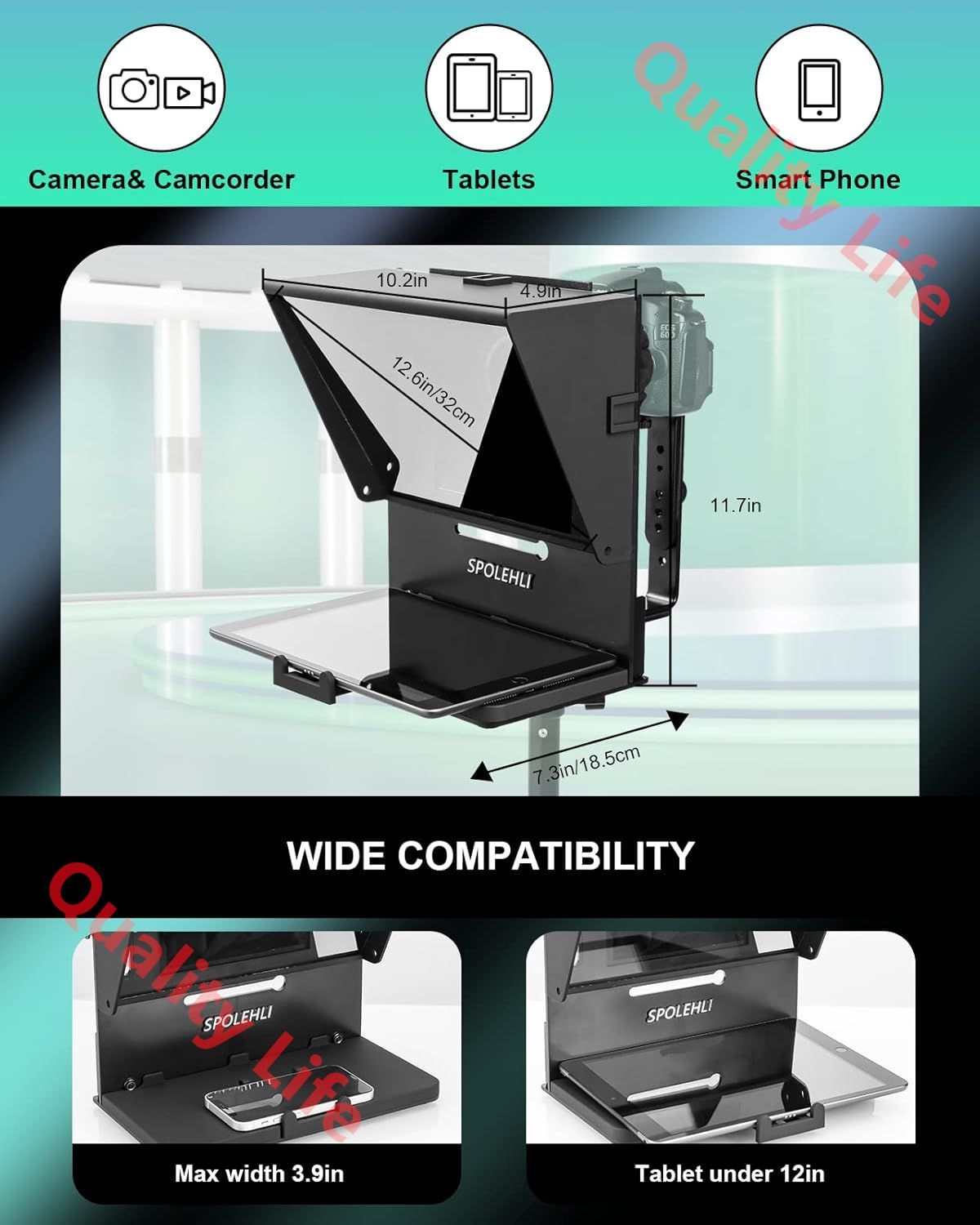 【万能&多機能】このテレプロンプターはデジタル一眼レフ、携帯電話、iPad/タブレットに対応しており、三脚、リングライト、マイク、1つは多目的に使用できます。