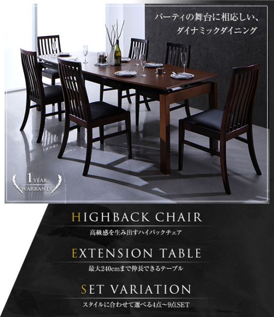 ハイバックチェア ウォールナット材 スライド伸縮式ダイニング 8人 9点セット テーブル チェア8脚 W 140-240
