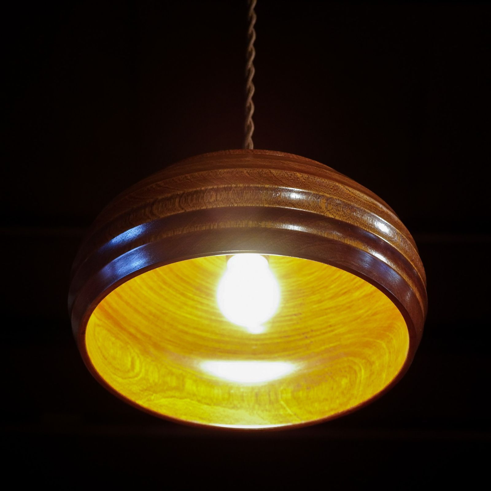 厚い木から丁寧に削り出された菓子器。その贅沢な器を素材に、ペンダントライトへと生まれ変わりました。