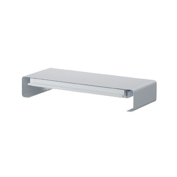 引き出し付きのモニタースタンド/ホワイト。デスク周りをすっきり整頓できます。引き出しの手前にスマートフォンやタブレット端末を立てかけられます。