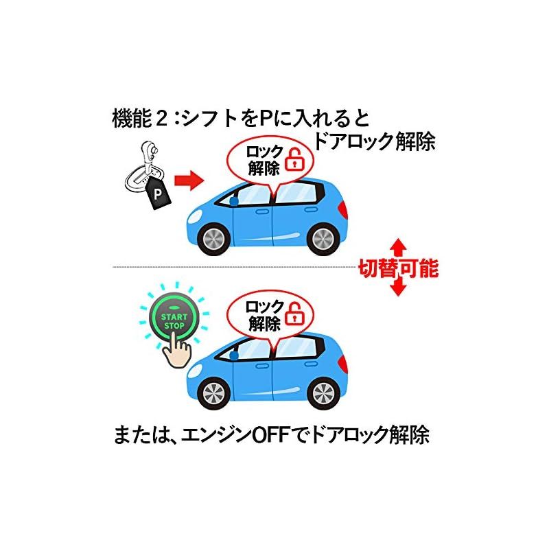 機能3.アンサーバックライト機能(機能のON/OFF切り替え付) エンジンを切って最初にドアを開けるとき(初回のみ)10秒スモールライトが点灯します。またアンロック操作時(スマートキーでアンロック1回押し時)お車のアンロックボタンを押した時)に、)10秒スモールライトが点灯します ※当アンサーバック機能につきましては、車種がグレード、社外品の兼ね合いなどによりご使用いただけない場合があります。製品の不良ではございませんので、当機能がご使用できない場合をご了承いただいた上で当製品をお買い求め下さい