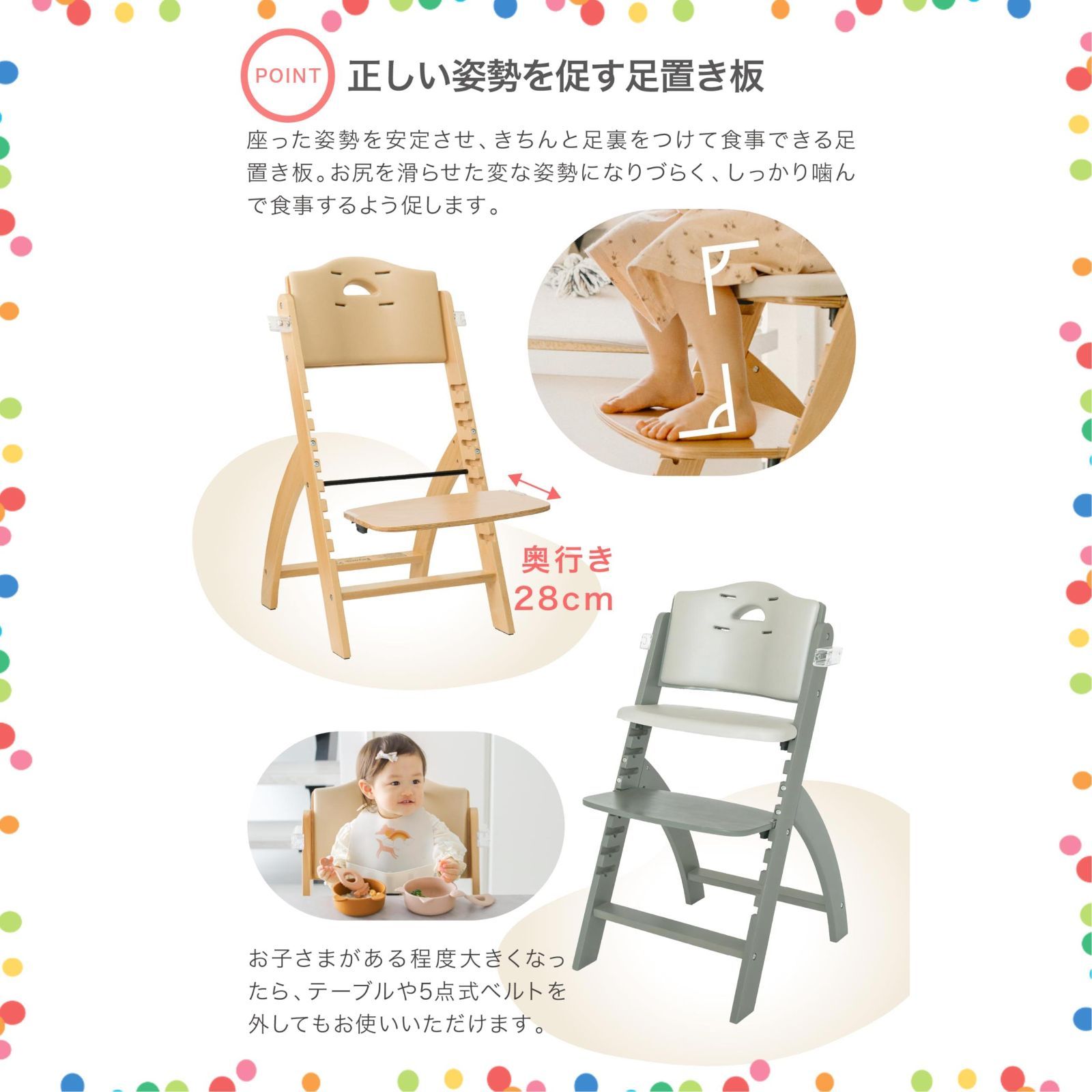 【赤ちゃんを守る標準装備】ビヨンドジュニア(Beyond Junior)は「EVA製の防水クッションと背もたれ」「ワンタッチで奥行きが調整できるテーブル&食洗機対応のテーブルカバー」「転落防止用のガード」「立ち上がり防止 5点式ベルト」「正しい姿勢を促す足置き板」「脚裏の滑り止め」など必要な物が最初からそろっています。