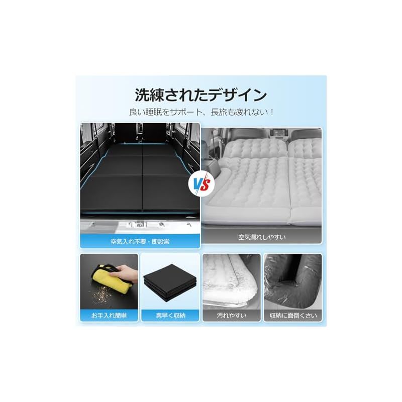 2.【折り畳み式・即設営/収納】従来の空気入れタイプは、空気漏れがやすく、設置も収納も手間がかかりすぎます!そこで、こちらの車中泊マットは便利な折りたたみ式で、設置/収納が一瞬でできます。座席を倒すだけで、一人だけ自由自在な空間ができます!キャンプや車内で一休みをしたい方にいつでもどこでも快適な睡眠をすばやく取らせることができます。