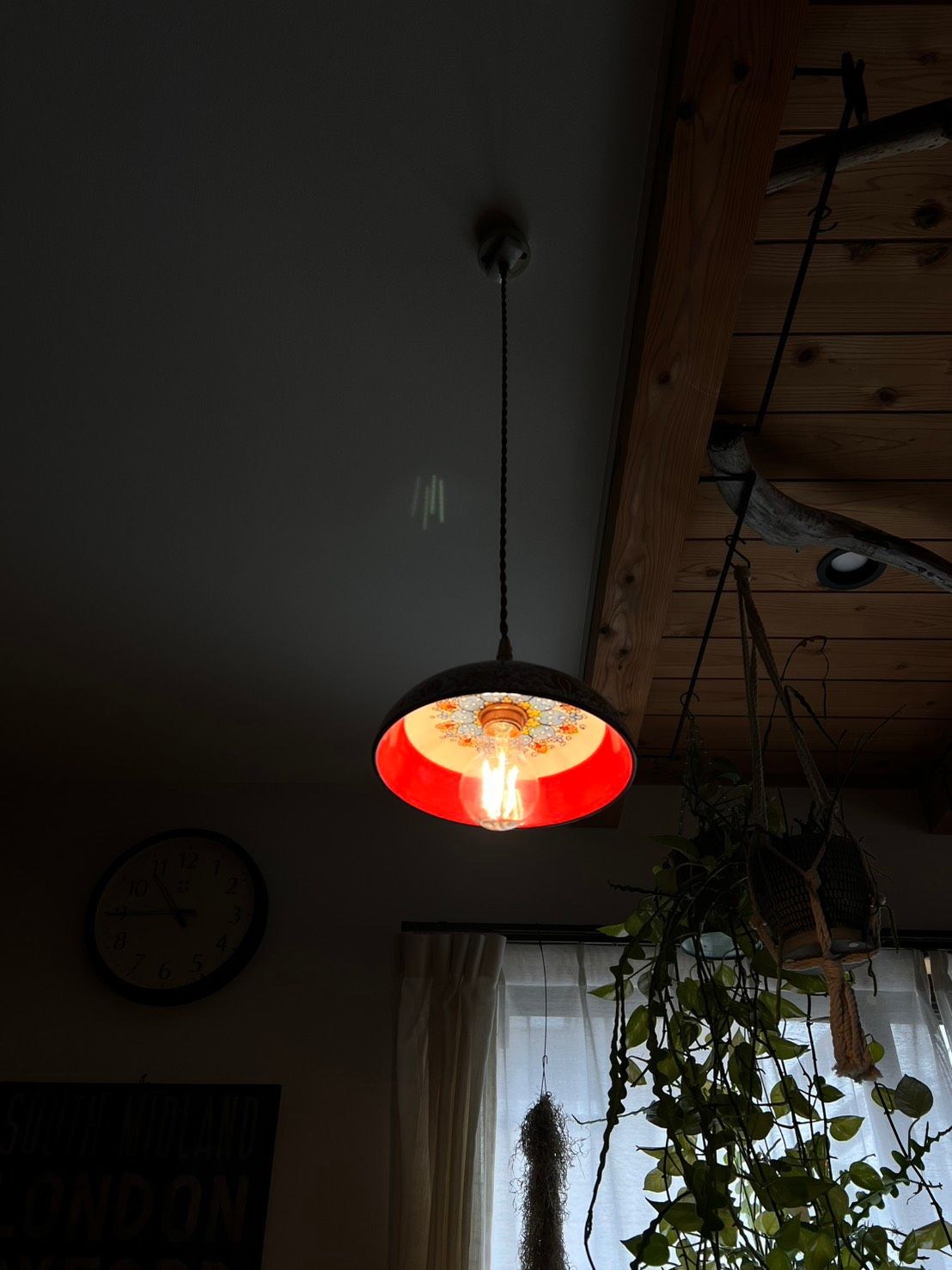 このペンダントは主役ライトとしてだけでなく、アクセントとしても機能します。ダイニングではシェード下端をテーブル面から65〜75cmの位置に取り付けることで、食卓に穏やかな陰影と色彩の反射を生み出し、会話と料理の見え方を豊かにします。玄関や廊下、トイレで使えば短時間でも深い印象を残せます。カフェやブティックのアクセント照明としても、商品や席まわりに温かさと個性を添える装置になります。