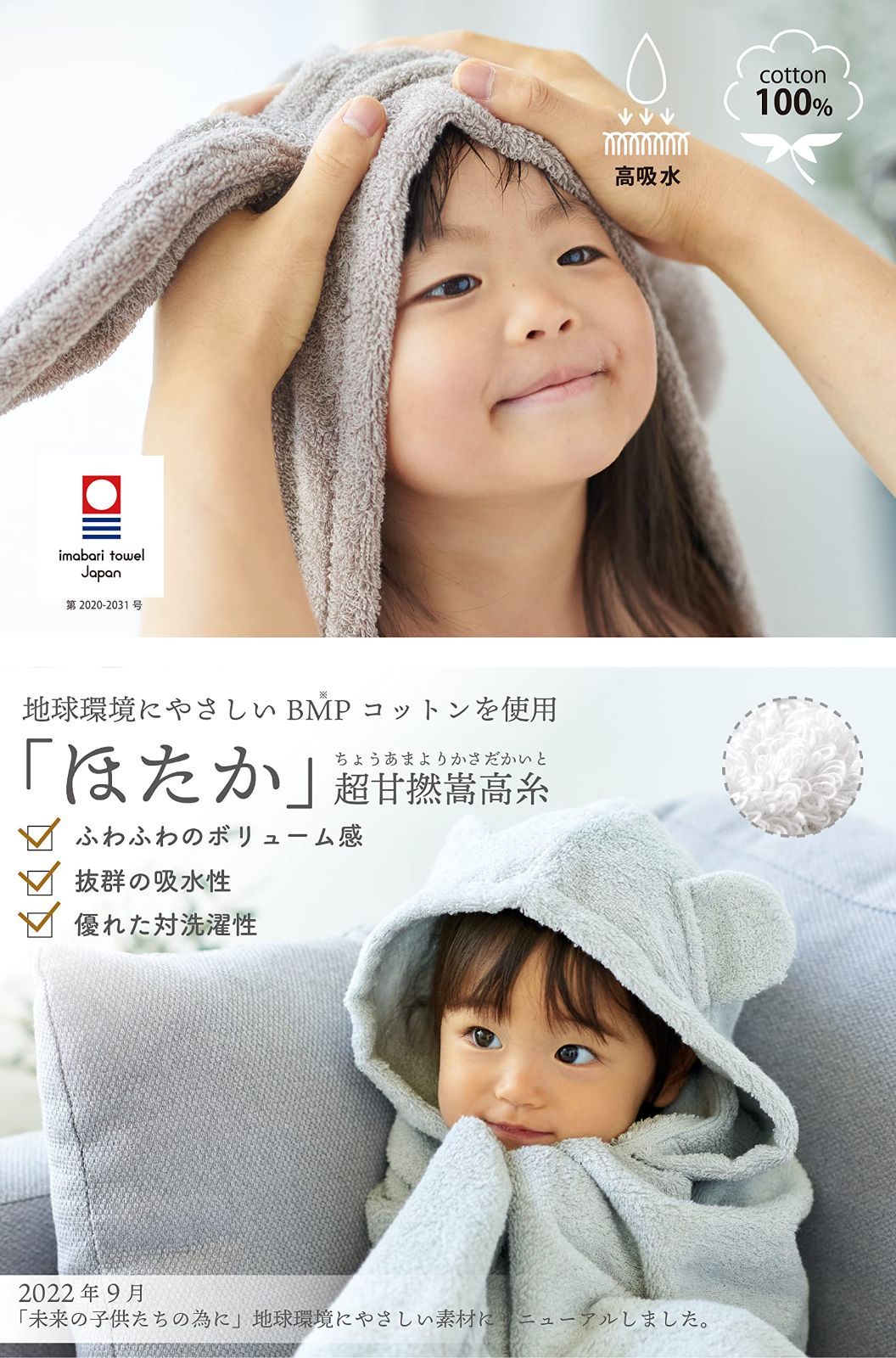「未来の子供たちのために」地球環境にやさしく、品質の高い「BMP(ベスト・マネジメント・プラクティス)コットン」に素材を変更。 超甘撚嵩高糸(ちょうあまよりかさだかいと)「ほたか」を使用。