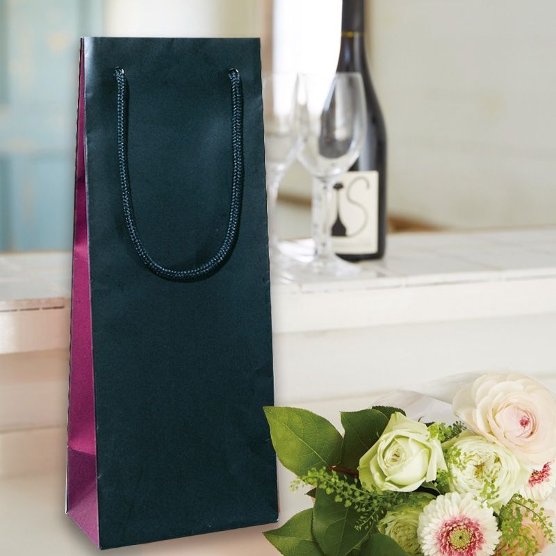 正面と側面を2色で彩りました。箱入りワインや一升瓶等も入る、ちょっと大きめの規格です。手紐:ポリエステル表面マットPP貼り口ボール・底ボール付
