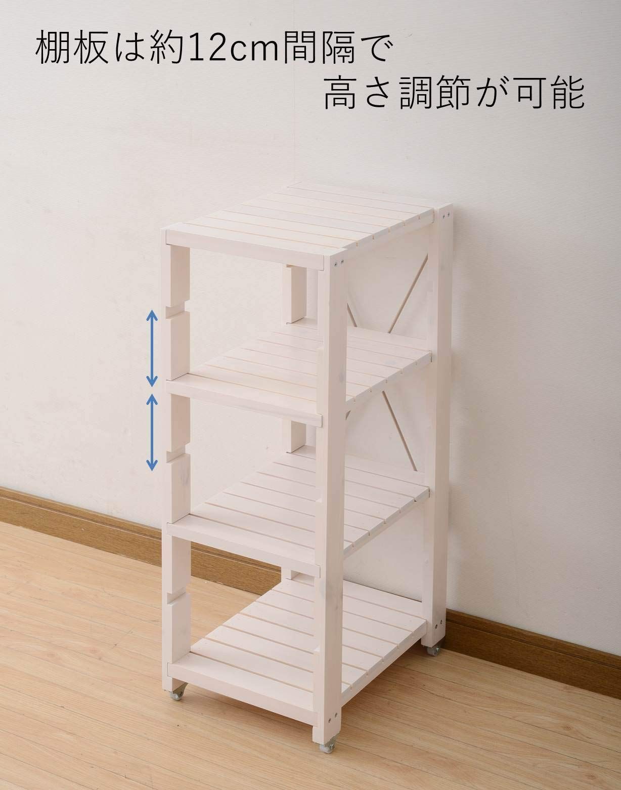 ●組立品です●組立時間:約20-30分●狭い隙間にピッタリのスリムな幅の収納ラック●棚板は約12cm間隔で高さ調節可能●棚の高さを変えるときも、取り外しは簡単●キャスター付きだから狭い隙間での出し入れもラクラク●最下段棚上から最上段棚下高さ:74cm●床から最下段棚上までの高さ:8cm