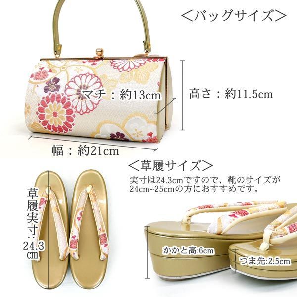 Lサイズ 振袖用 草履バッグセット zb-074 二枚芯 成人式 振袖 小紋 金 ゴールド 菊 捻り梅 県 は 京都うさぎ堂