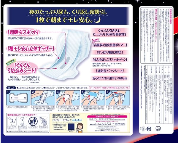 たっぷり10回分をぐんぐん吸収するので、尿量の多い方でも一晩中安心な尿とりパッドです。