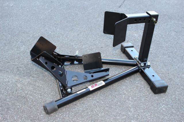 調整式フロントホイールクランプスタンドはシーソー構造で前輪を乗り上げるだけでバイクが自立します。