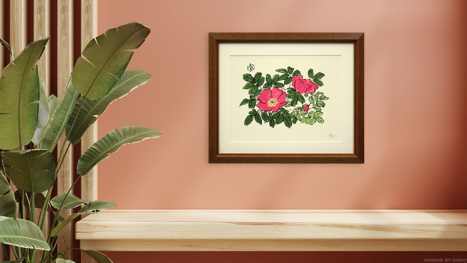 ほのぼのとした筆致と鮮やかながらも優しい色使いで描かれた、可愛らしいハマナスの花。北海道の自然と共に歩んだ画家の、植物への深い愛情と温かい眼差しが伝わります。画面から漂う穏やかな気配は、日々の暮らしにそっと彩りを与えてくれるようです。