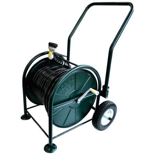 ノーパンクタイヤ付きのホースリール。丈夫なスチール製です。●外寸(幅)[mm]:600●外寸(奥)[mm]:640●外寸(高)[mm]:850●質量[kg]:19●ホース長[m]:60)●ホース内径[mm]:15●付属品:補助ホース15×20mm(長さ3m)、蛇口アダプター、バンド(USAクランプ)●ホース外径[mm]:20●散水口:メタルセブンノズル(きり、広角、横拡散、シャワー(外)、セイリュウ・シャワー(中)、ジェット)