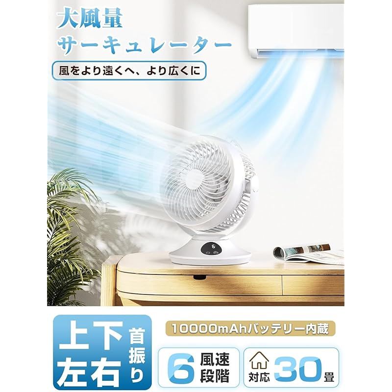 2025新登場 サーキュレーター 扇風機 壁掛扇風機 6段階風量調節 左右首振り 静音DCモーター 30畳パワフル送風 usb充電式 10000 mAh大容量 12 Hタイマー機能付き ワット時 2-5 Wh リモコン付き 自動運転 お手入れ簡単 オールシーズ