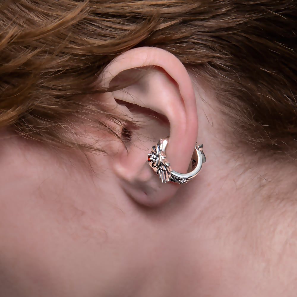 A single bloom taking flight. The Rose Ear Cuff layers wings, arabesque scrolls, and a sculpted rose into a striking miniature sculpture, crowned with a deep red natural garnet. From the rise of each petal to the feathered tips, every contour is crisply rendered; the interplay of mirror-polished silver and subtle oxidation adds dramatic depth. Though the silhouette is bold, the inner curve follows the ear for a light, secure fit.