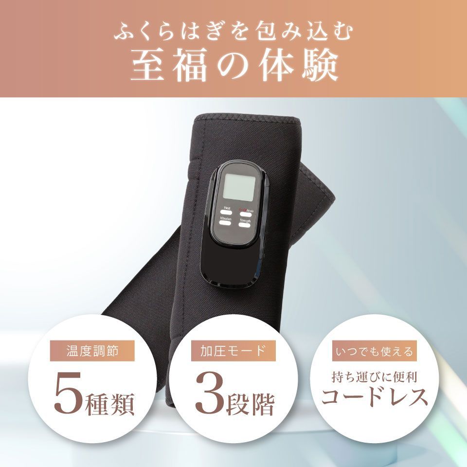 ●商品名:レッグマッサージャー REBODY+-リボディプラス-●素材:ABS/ポリエステル●生産国:中国●カラー:ブラック(モニターの発色具合によって実際のものと色が異なる場合があります。●電圧:約5V●バッテリー:2500mAh リチウムイオンバッテリー●箱サイズ:約37×25×8.5 (cm)