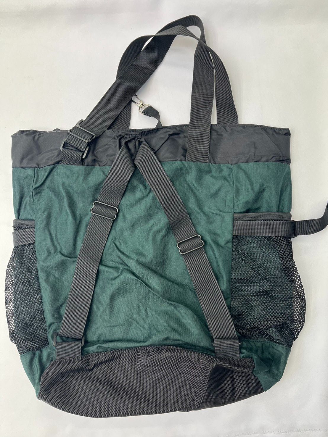 4つのメッシュポケットが便利なナイロントートバッグ。上部を絞ればバックパックにも変身。伸縮式フック、マチを絞るストラップやバックルを外せば隠し内ポケットがあって至れり尽くせりの構造です。1998年ころのデッドストック品で新品未使用ですが緑のみ紙タグが付いておりません。赤は全て紙タグが残っています。大きさは平置きで縦44横50cm。