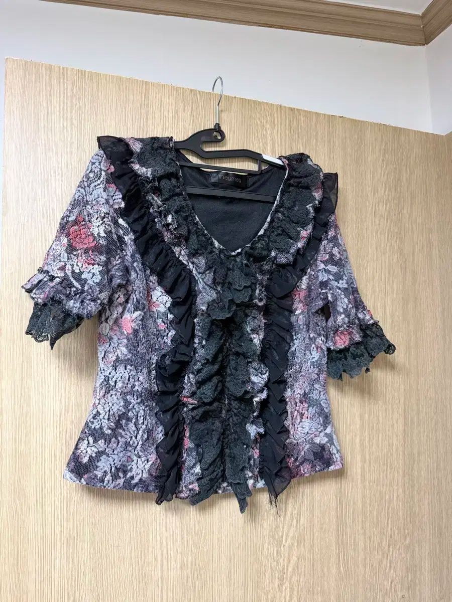 maymay レースブラウスにフリル装飾のある商品です。ユニークなデザインのレースのおかげで、ユニークなスタイルを演出できます。特別な日にポイントを加えたい時に着ると良いと思います。