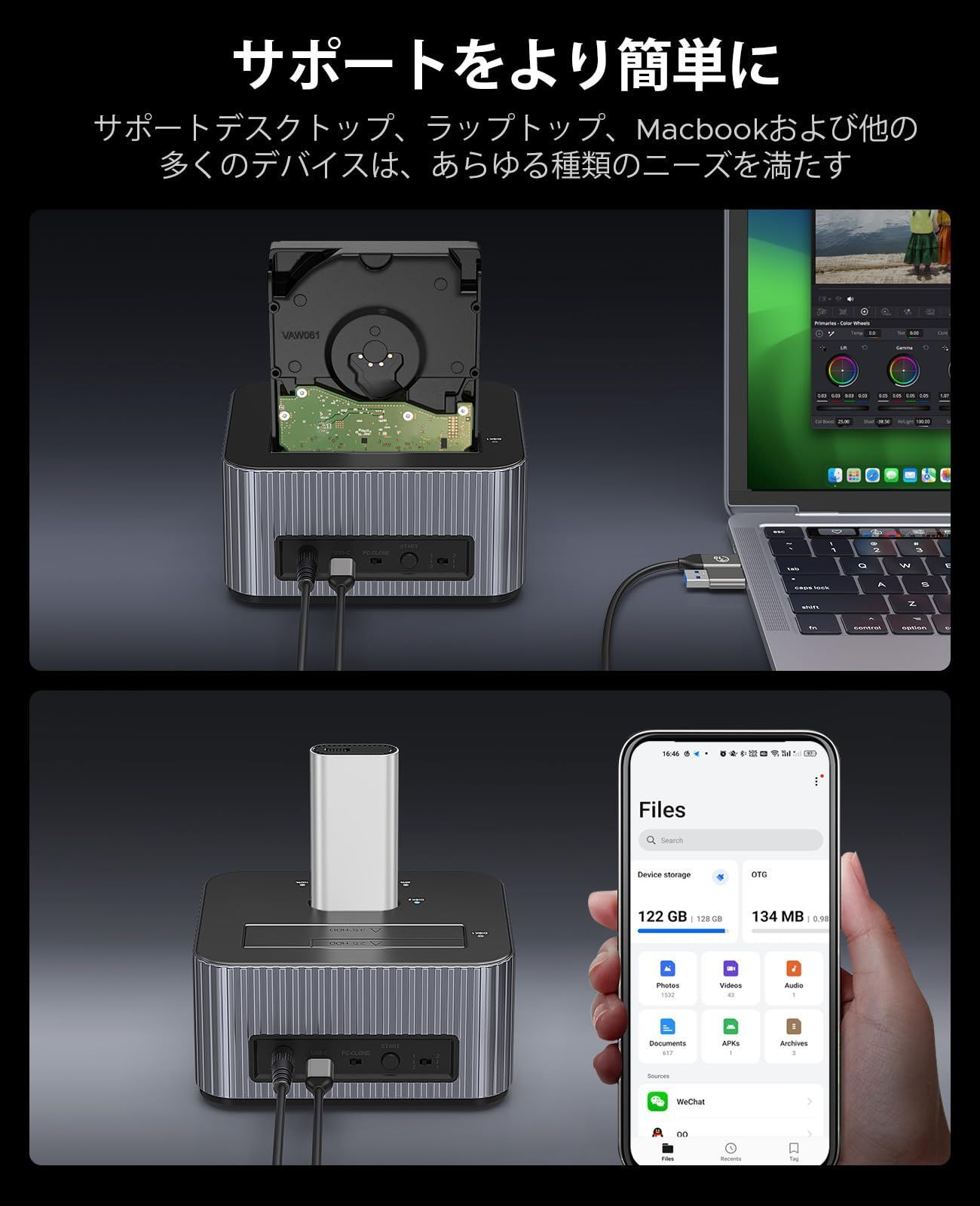 【ワンキー双方向オフラインクローン】SSD HDD スタンドはオフラインクローン機能をサポートしており、コンピューターに接続せずにHDD SSD クローンを作成できますソース ディスクとターゲット ディスクをカスタマイズして、NVMe ハード ドライブと SATA ハード ドライブ間の双方向クローン作成を簡単に実現できます。ターゲット ディスクはソース ディスクより大きくなければならないことに注意してください
