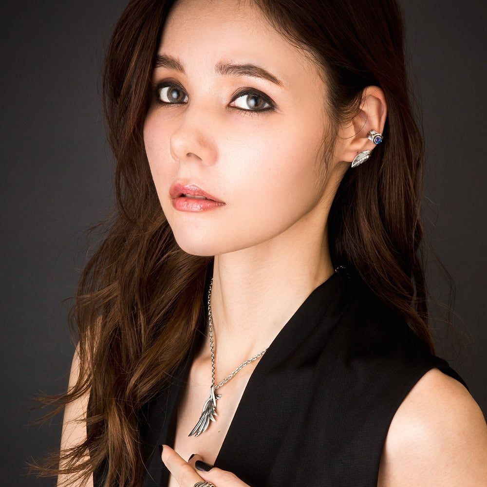 The arc of a wing, brought into relief through layered sterling-silver lines. Finely tiered feathers interlace to form a sculptural silhouette, while mirror-polished ridges and softly oxidized recesses create precise depth and shifting light from every angle. The asymmetric vertical drop refines the neckline and lends effortless elevation to any look.