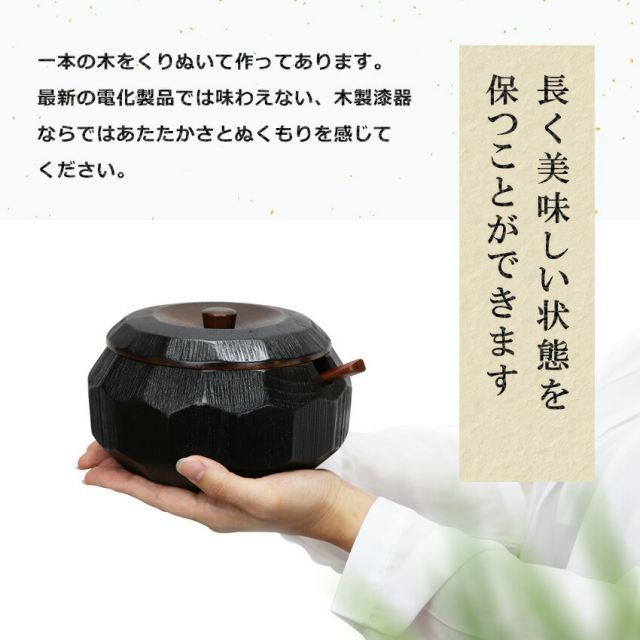 木製漆器は、余分な水分を逃がし、必要な水分を保つから、いたみにくくで美味しい!また、めしびつ自体が木のにおいがするため、ごはんもいい香りがします。最新の電化製品では味わえない、木製漆器ならではあたたかさとぬくもりを感じてください。