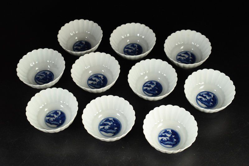 蔵A 2984 c 1 平安 滝口 加全造 染付山水人物図 菊形小鉢 向付 十客