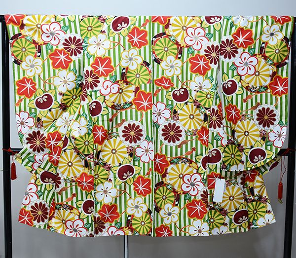二尺袖着物 仕立て上がり 夢千代 着物丈は着付けし易いショート丈 合繊 卒業式 アイボリー×緑 NO 29012-4
