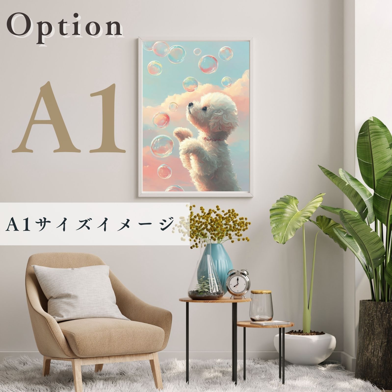 かわいいビションフリーゼ犬が、空に舞うシャボン玉を見つめる愛らしい瞬間を切り取ったアートポスターです。