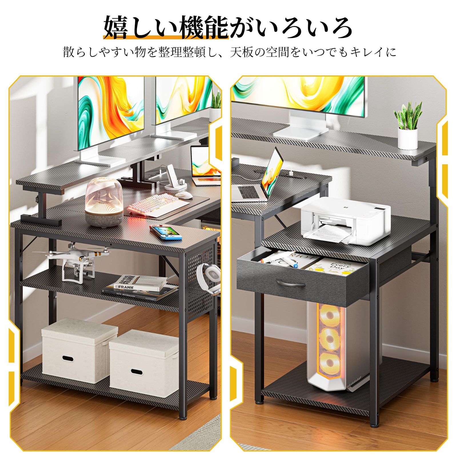 【様々なシーンで大活躍L字デスク】L字デザインのデスクで、部屋を最大限に活用し、さまざまなコーナーにピッタリ!ゲーミングデスクとしては、ゲームプレイ、在宅勤務、書斎机、勉強机などで大活躍!