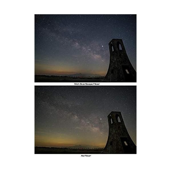 StarScape スタースケープ は、マルミが独自に開発した光害カットフィルターです。|有害光を吸収する成分をガラスに練り込むことで、夜空がオレンジ色や黄色に色カブリを起こしてしまう現象を抑制し、クールな夜空を演出します。|また、どのホワイトバランスを選択しても極端な色転びがなく、星空撮影で大切な明るさも露出倍数1.2(約1/4絞り分)を確保できます。|優れたカラーバランスと高い透過率が特徴です。タイムラプス撮影にも最適です。| 広角レンズ対応 |StarScapeはコーティングによる光害カットフィルターとは異なり、ガラスが光害成分を吸収しますので、広角レンズを使用しても色ムラが起きません。レンズの焦点距離を選ばず、星景・夜景を快適に撮影いただけます。| 撥水コーティング採用 防汚コーティング採用 広角レンズ対応 薄枠設計 サテン仕上げ ローレット加工| レンズ外周墨入れ加工 レンズキャップ・フード取付可 携帯フィルターケース付き 日本製|デジタル・フィルム使用可|