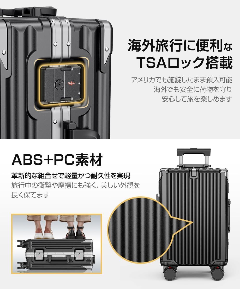 【大容量&頑丈設計・安心の旅をサポート】この スーツケース は、驚くほど軽量でありながら、頑丈なアルミフレームを採用。特に長距離移動や多くの荷物が必要な旅でも、中身をしっかりと保護します。衝撃に強い設計と耐久性の高い合金製の保護コーナーにより、過酷な環境下でも安心です。さらに、USBポートとカップホルダーが搭載されているため、旅行中でもどこでもスマートフォンを充電したり、飲み物を手軽に持ち運ぶことができます。