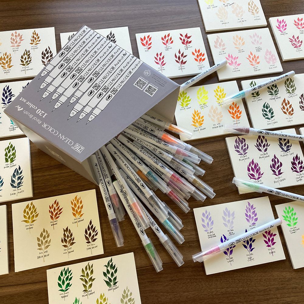 毛筆タイプのカラー筆ぺん。鮮やかな色合いで水彩アートやレタリングが手軽楽しめるカラーブラッシュペンです。全120色がセットになりました。