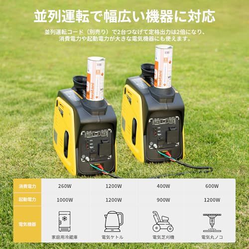 【並列運転でより幅広い機器に対応】別売りの並列運転コード(商品ASIN:B09KMD2X8K)で同士2台をつなげて最大1.33kVAの出力を得ることができます。家庭用冷蔵庫、洗濯機などの大型家電だけでなく、電気サンダー、電気丸ノコなどの高負荷の電動工具にも使用可能です。並列運転コードの接続もコントロールパネルにある並列端子に挿入するだけで完了します。それに、波形ひずみが少なく高品質の電源を供給する正弦波インバーターを搭載し、パソコンなどの精密機器やマイコン搭載機器も安心してご使用いただけます。