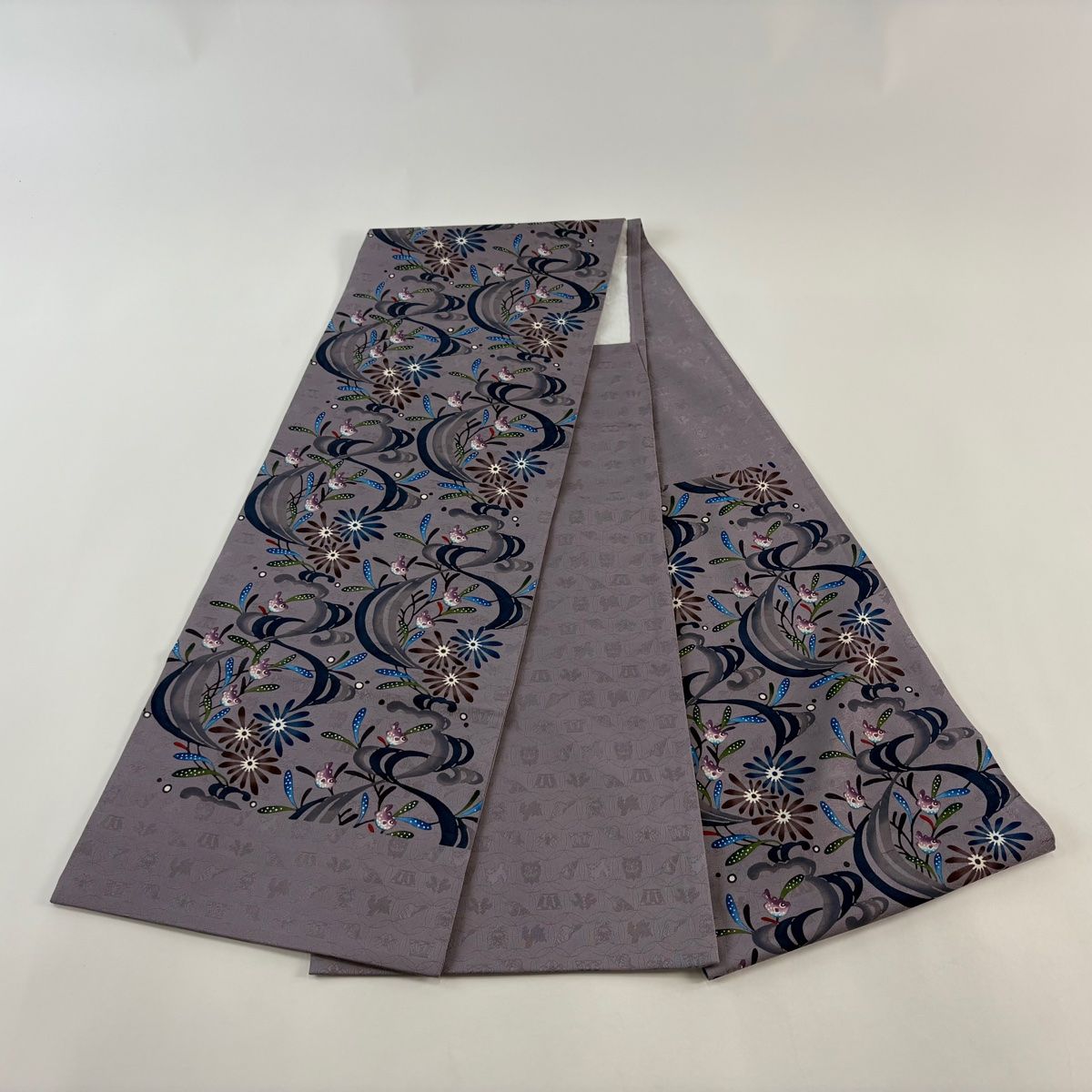 開き名古屋帯 城間栄順 落款 魚 波 灰紫 正絹