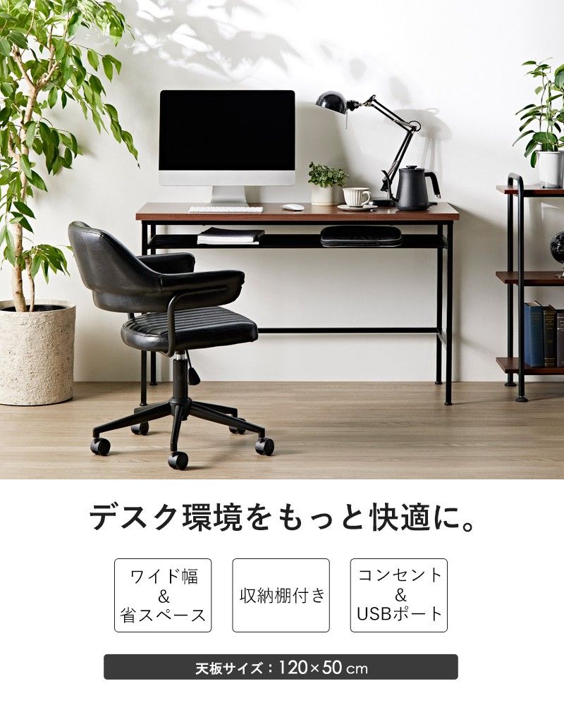デスク パソコンデスク 幅120 奥行50 おしゃれ コンセント usb 収納 棚付きpcデスク ワークデスク 書斎机 ワイド 省スペース 北欧 ヴィンテージ ウォールナット 木目 木製 鉄 スチール ブラウン ブラック 新生活