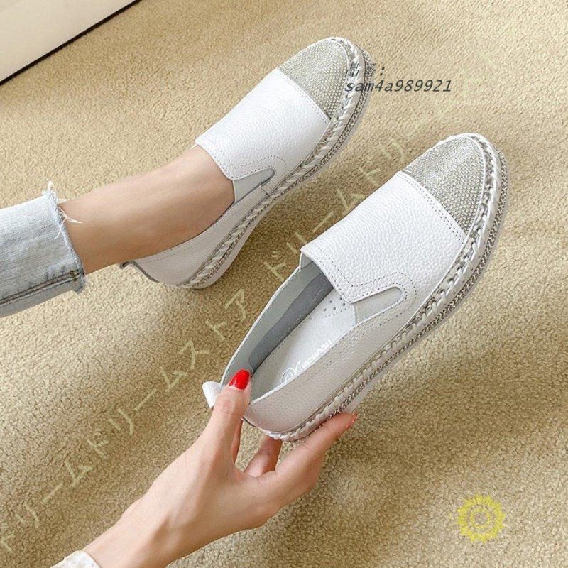 スリッポン スニーカー レディース 厚底 キラキラ ラインストーン 大きいサイズ おしゃれ 牛革 白 カジュアル 黒 フラットペタンコ am 4 a 989921