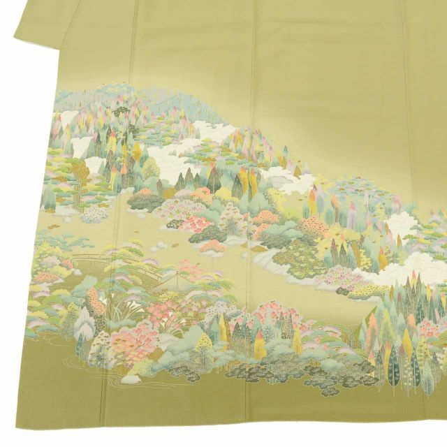 リサイクル着物 訪問着 正絹 絹 SILK シルク Mサイズ ちょっとふくよかL 特品 身丈160 cm 裄丈63.3 袷 仕立て上がり 一つ紋 友禅 落款有り 作家物 緑 風景 リユース uu 1765 b