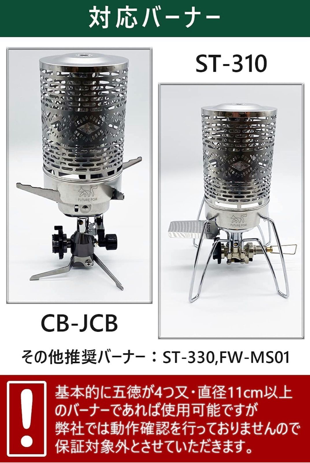 弊社で推奨しているバーナーはイワタニ ジュニアコンパクトバーナー CB-JCB、SOTO レギュレーターストーブ ST-310、FORE WINDS マイクロキャンプストーブ FW-MS01となります。その他のバーナーで使用された際に故障等が生じた場合は保証対象外とさせていただきます。