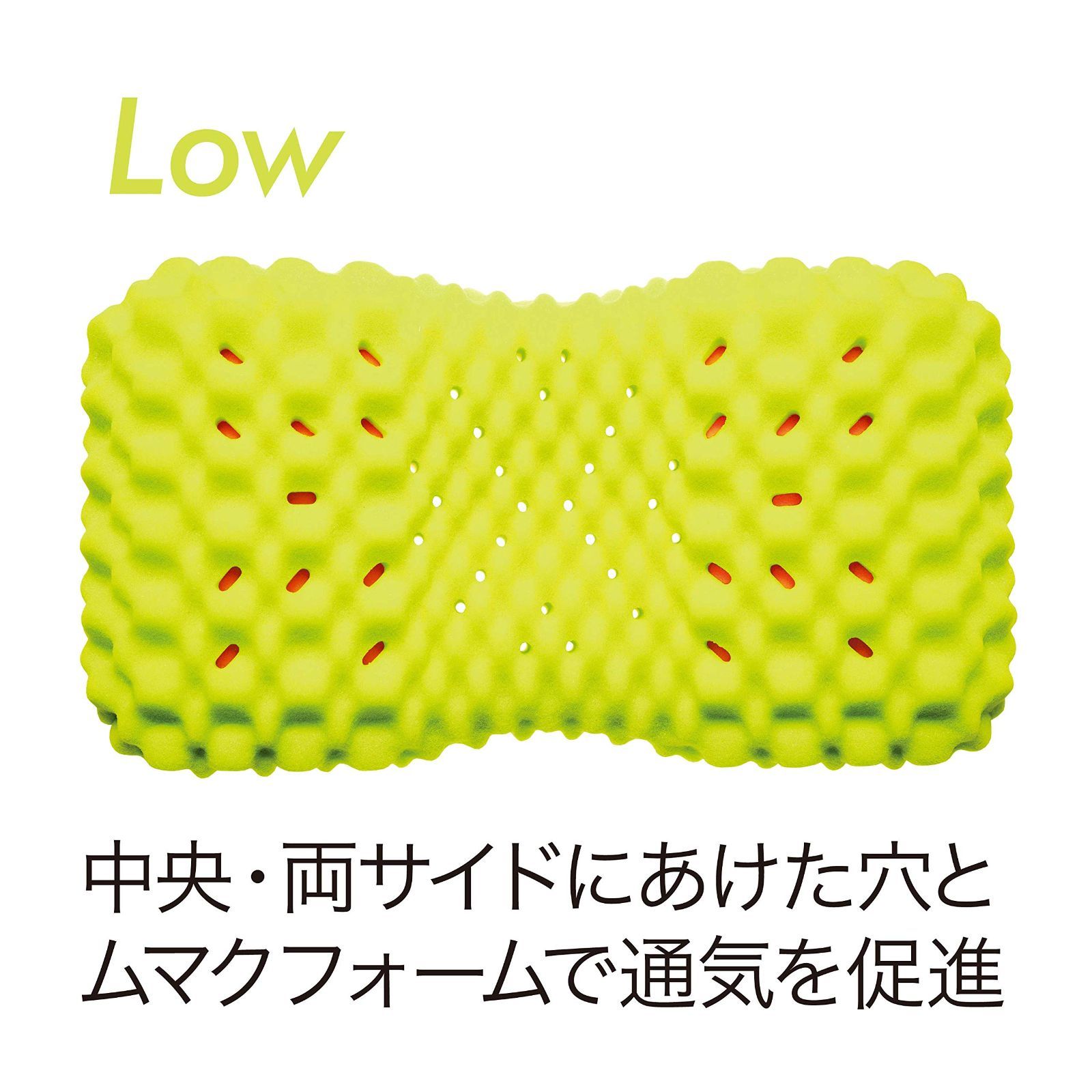 通気性のよいムマクフォームと中央 両サイドにあけた穴で睡眠中の蒸れを抑える 好みの高さに調節 低め 高め 高いクッション性で寝返りをサポート 頭圧分散構造 凹凸形状とネックサポートシステムによる高いフィット性 グレー 眠りを
