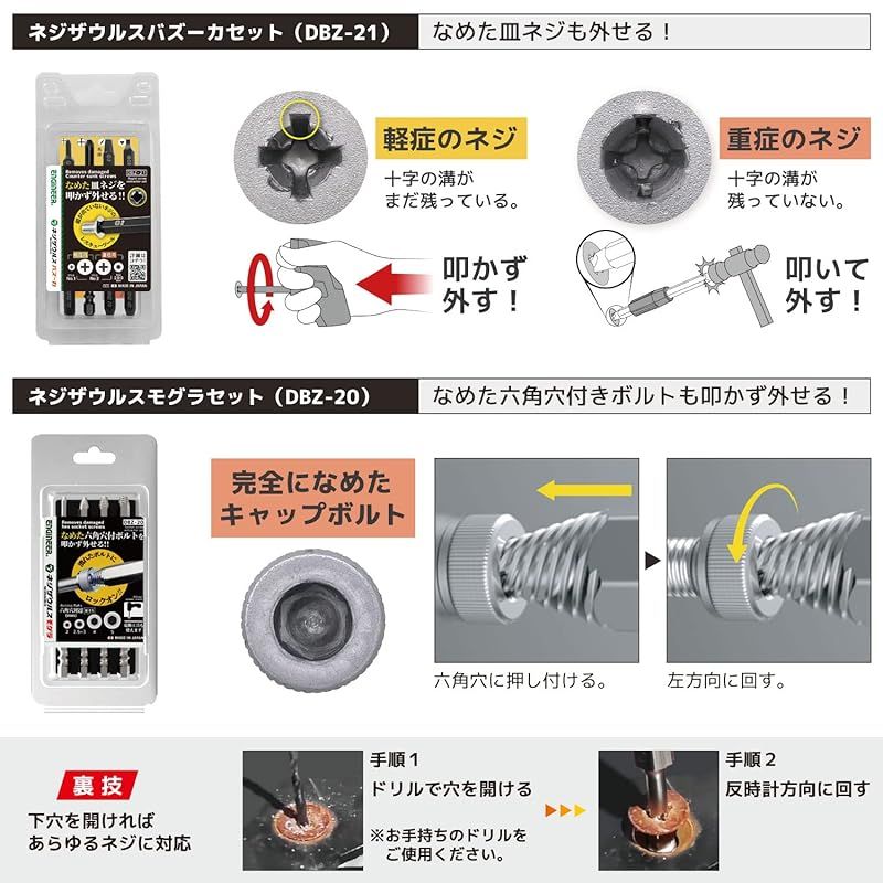DZ-70/強力なトルクを生む、人間工学(エルゴノミクス)デザインのドライバー。 ・DBZ-20、DBZ-21/独自の先端形状により、潰れたプラスネジ、六角穴付きボルトを叩かず外せます。