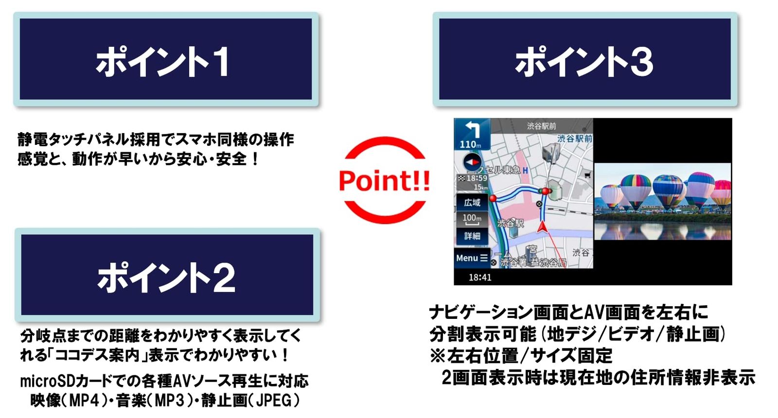 地図案内のわかりやすさを追求。曲がるタイミングと方向がわかりやすい「ここです案内」搭載の5V型ワンセグポータブルナビゲーション。地図がはっきりクッキリ見やすく、スマホのようなフリックやピンチイン/アウトで指先でカンタンにスムーズに操作できる静電容量式パネルを採用。自社位置精度を高める3Dセンサー&3種の衛星受信を搭載。【3Dセンサー】ジャイロ3軸&加速度3軸の高精度3Dセンサー搭載で高架下などの測位しずらい場所での精度が向上し、高い自車位置精度で走行できます。