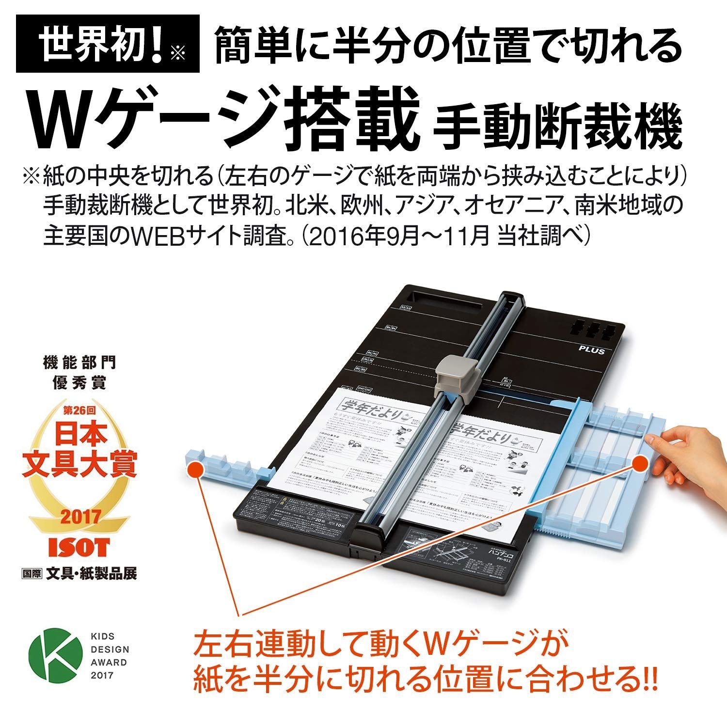 [※1] 紙の中央を切れる(左右のゲージで紙を両端から挟み込むことにより)手動裁断機として世界初