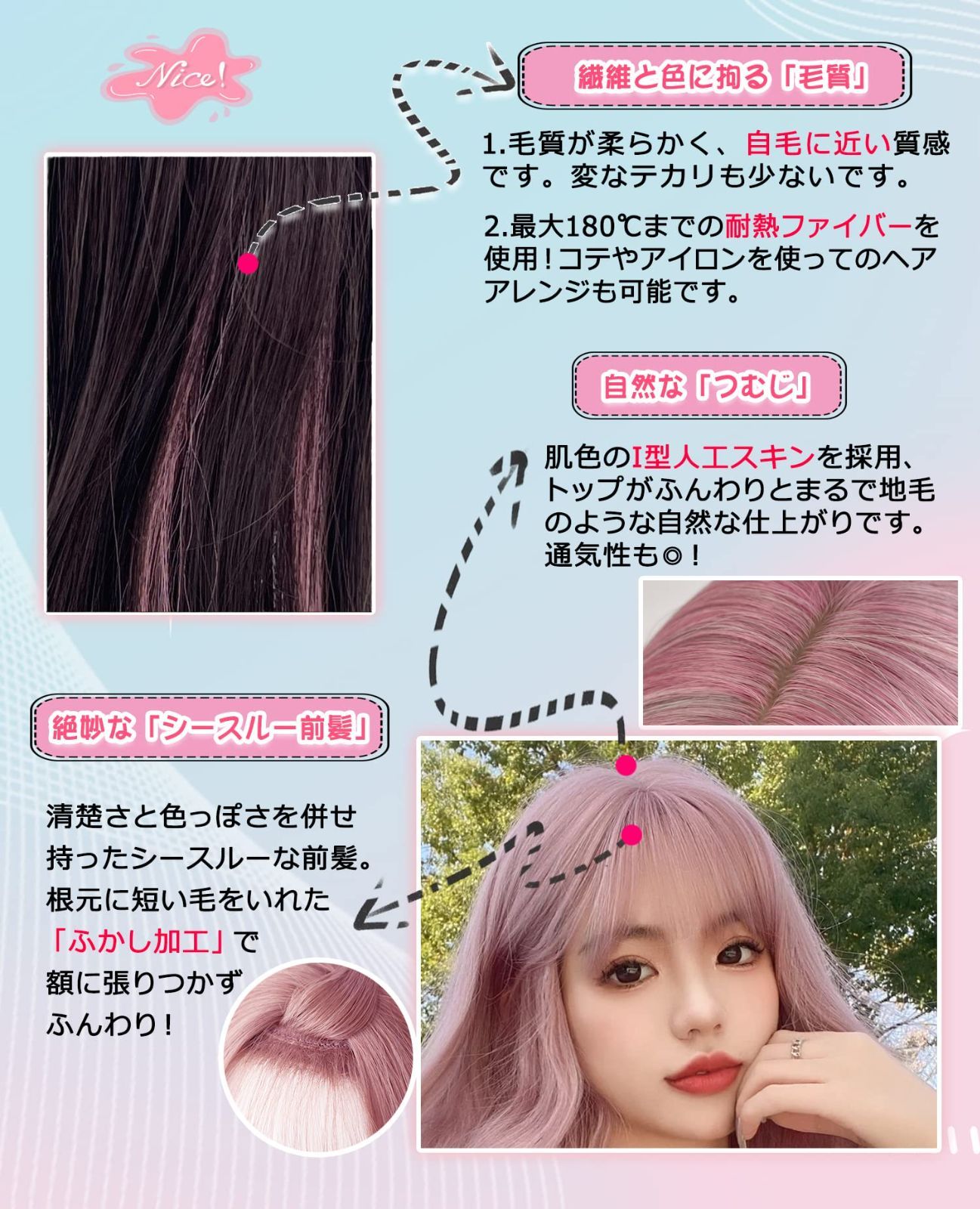 素材構成: 約180度耐熱ファイバー、ドライヤー、コテ、アイロン等で好みの髪型に整えることができます。