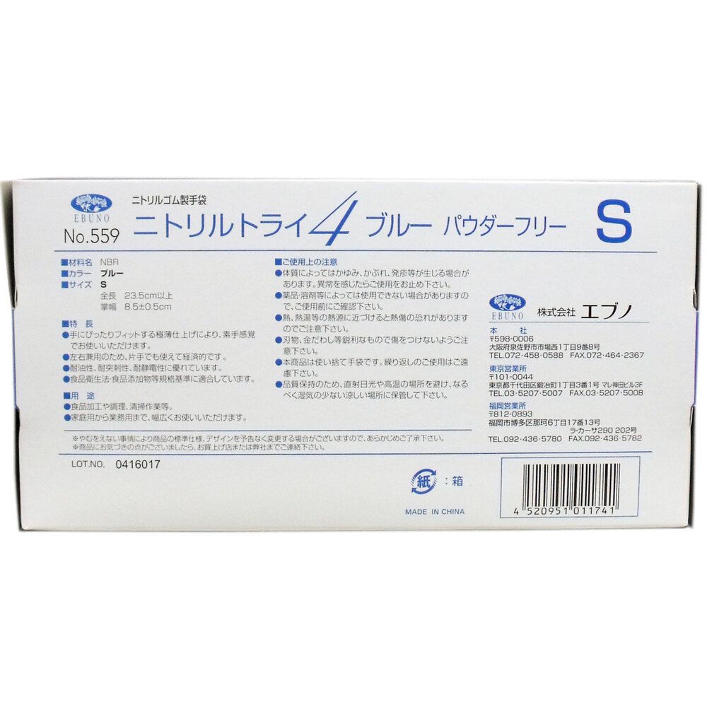 セット 業務用 No.559 ニトリルトライ4 ブルー パウダーフリー ニトリルゴム製 使い捨て手袋 Sサイズ 入