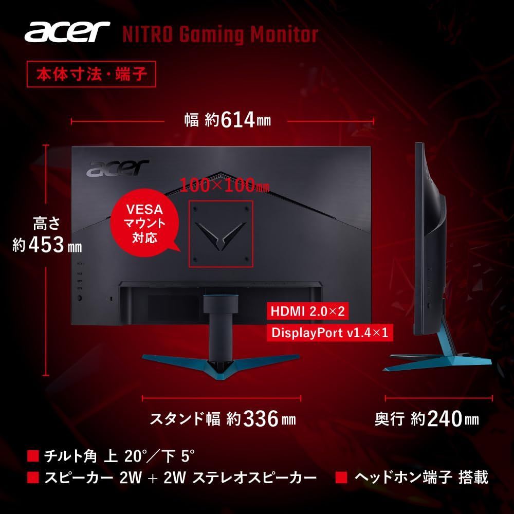Acer Nitro ゲーミングモニター 27インチ WQHD 広視野角 IPS 非光沢 240Hz 0.5ms(GTG) AMD FreeSync Premium sRGB 99% HDR400 ブルーライトシールド HDMI 2.0 DisplayPort v1.4 スピーカー・ヘッドフォン端子 VESAマウント対応 ゼロフレーム VG272UW2bmiipx