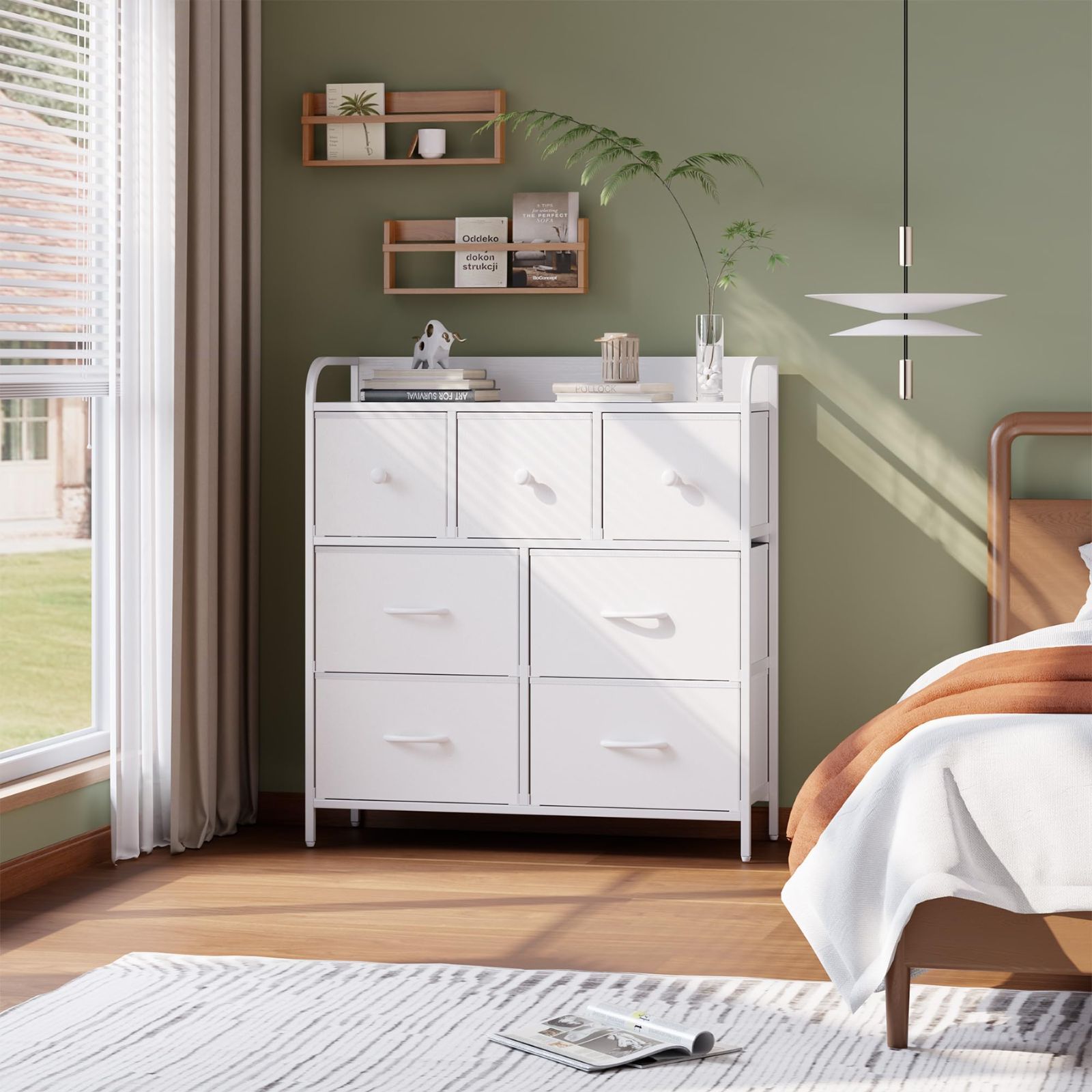 【広々7段ドレッサー】折りたたみ式で取り外し可能な7つの引き出しが付いたチェストドレッサーは、十分な収納スペースがあり、3つの小さな引き出しで小物を効果的に整理し、4つの大きな引き出しで衣類、タオル、毛布などを上手に収納できます。木製の天板は、時計、写真、ランプ、CDなど、よく使うものを手の届くところに置くのに最適です。
