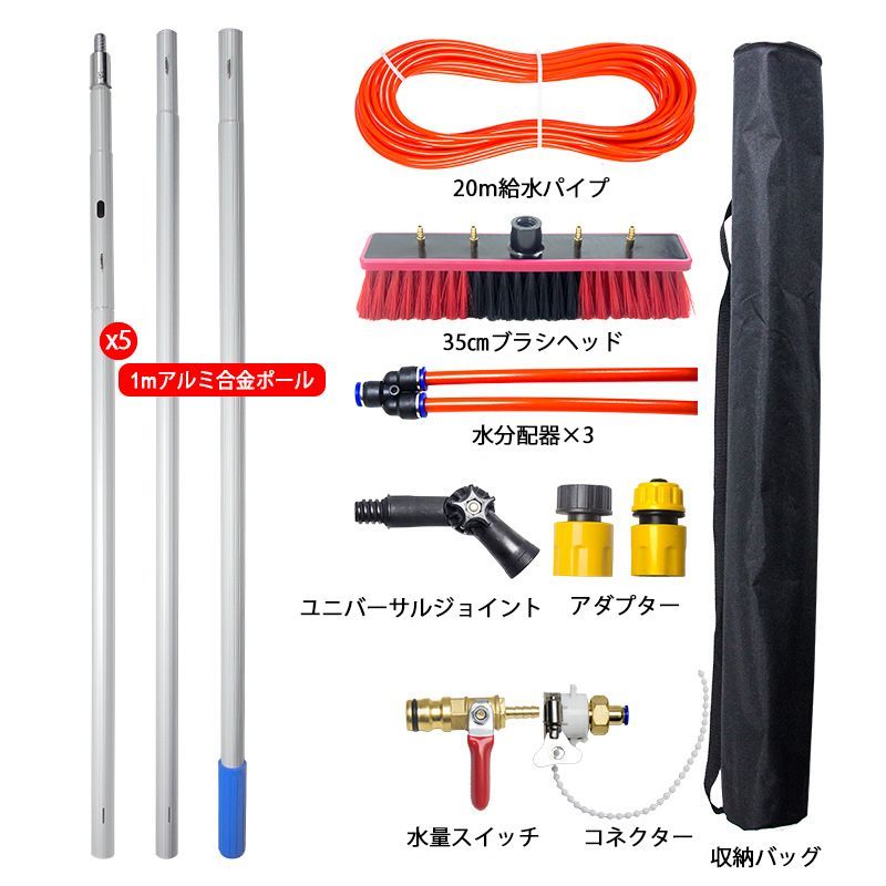◇付属品:1mアルミ合金ポール×5、20m給水パイプ、35cmブラシヘッド、水分配器×3、ユニバーサルジョイント×1、アダプター、水量スイッチ、コネクター、収納バッグ